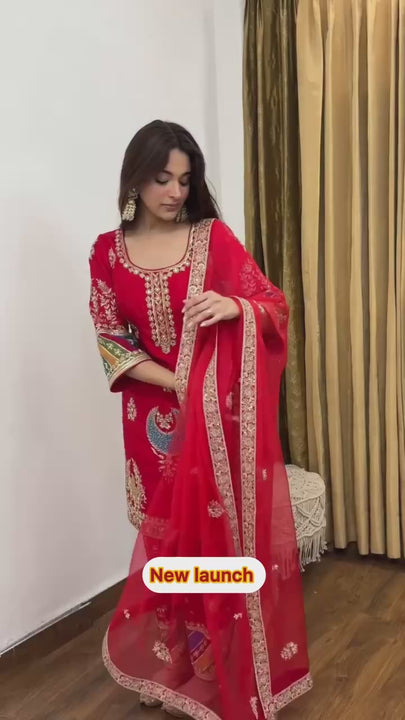 Product Overview: Elevate your ethnic charm with this stunning Designer Suit Set, meticulously crafted from Heavy Natural Crep Silk. This vibrant Red ensemble features exquisite 5mm Sequence Embroidery Work, making it a perfect choice for weddings, receptions, and grand festive celebrations.