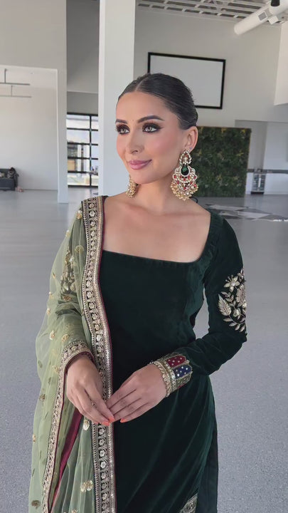 Long Viscose Velvet Kurti with Heavy Embroidery & Silk Pant Set
